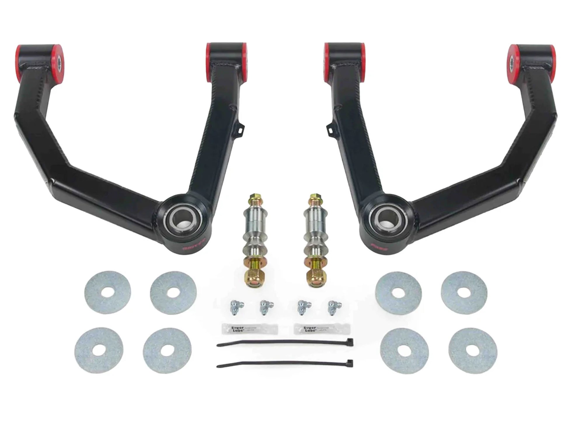 There are multiple issues when lifting your vehicle with stock upper control arms. Both the geometry and strength are compromised due to over articulating the stock arms. Dirt King solved these problems by designing their upper control arms with increased castor and repositioned pivot angles reducing stress on the joints. The increased castor allows for proper alignment and improved handling. Dirt King also replaced the weak factory ball joints with 1” stainless steel uniballs for maximum strength and increased articulation. For the inner pivots Dirt King uses durable urethane bushings with grease fittings for easy servicing. To mount the arms to the spindle Dirt King includes high grade 17-4 stainless steel misalignment spacers and military grade F911 hardware. All of the components on their upper control arms are rebuild-able or replaceable to make this product last a lifetime. The arms come preassembled and include detailed instructions for easy installation.