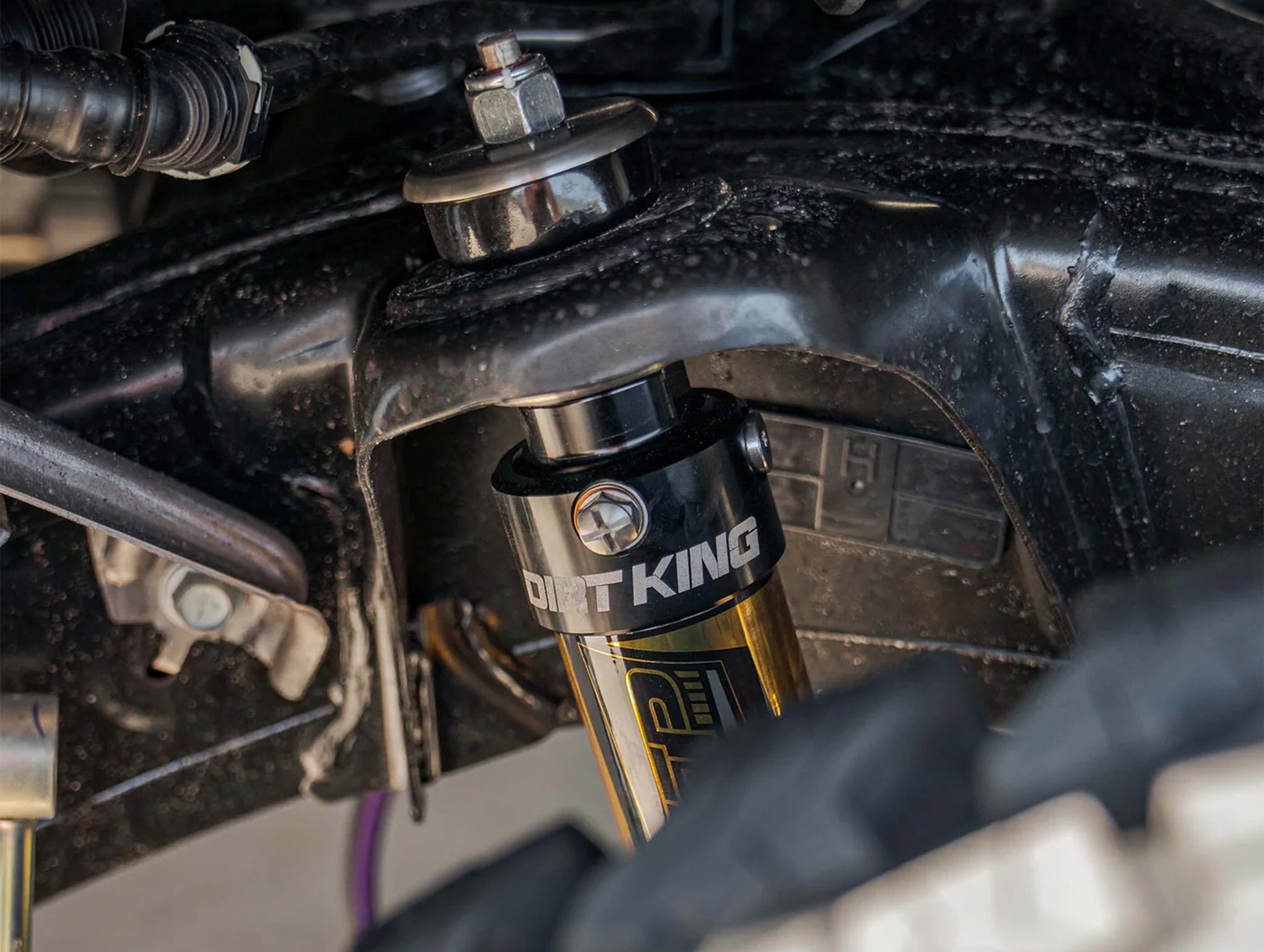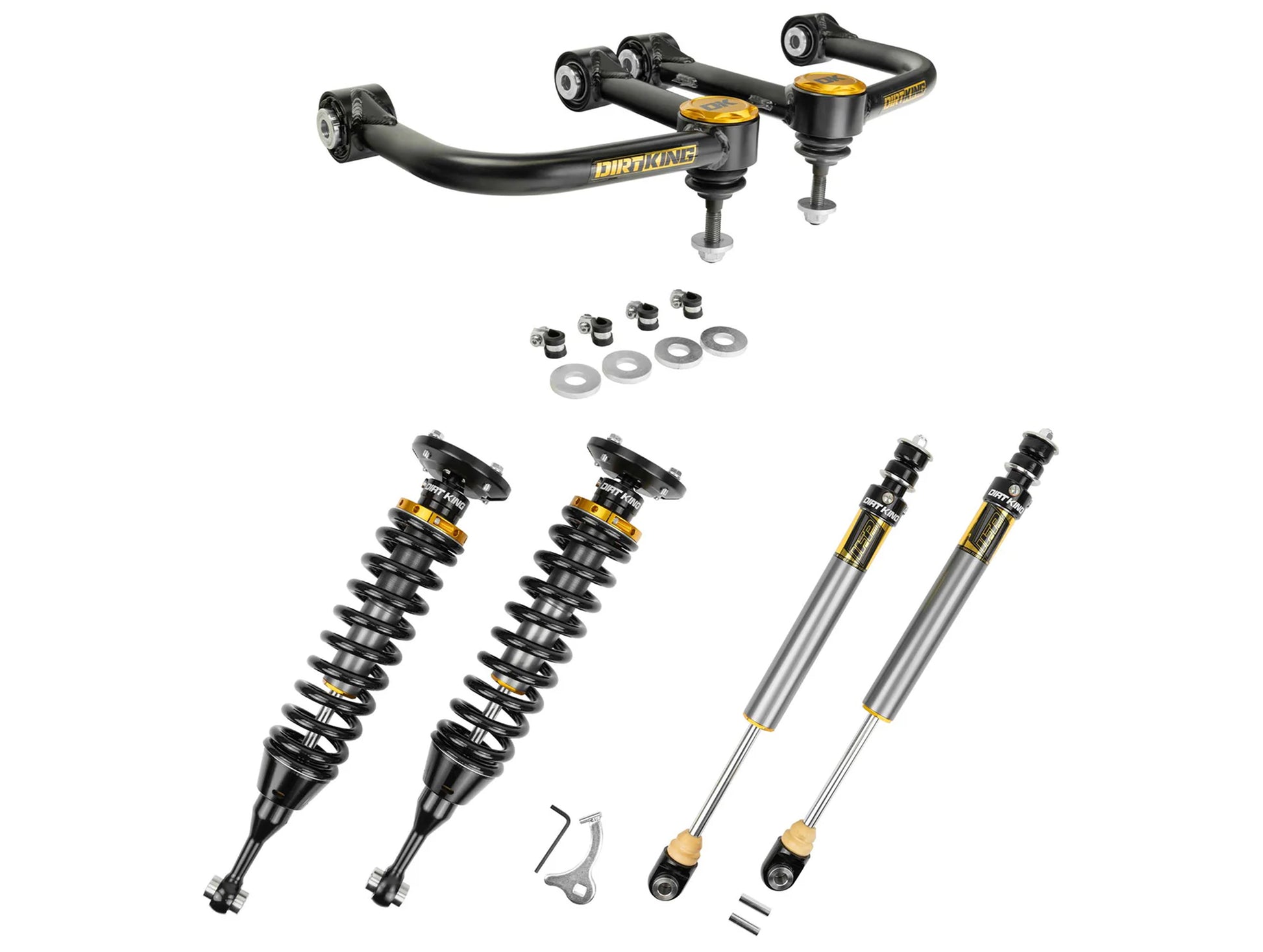 Transform your Tacoma by eliminating front-end rake and achieving a leveled lift with the Dirt King MT Trail Runner Kit. This cost-effective solution includes Dirt King's 4130 Upper Control Arms, 2.0 IFP Front Coilovers, and 2.0 IFP Rear Shocks—all expertly tuned for superior comfort during everyday driving and on rugged trails. It's the perfect choice for those looking to enhance their vehicle's appearance and ride quality without the premium price tag of an extreme off-road package. For unmatched off-road control, adjustability, and high-speed desert capability, consider the Dirt King MT PreRunner Kit.