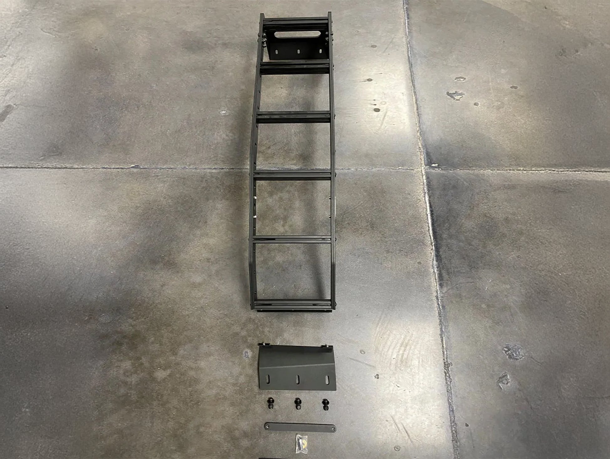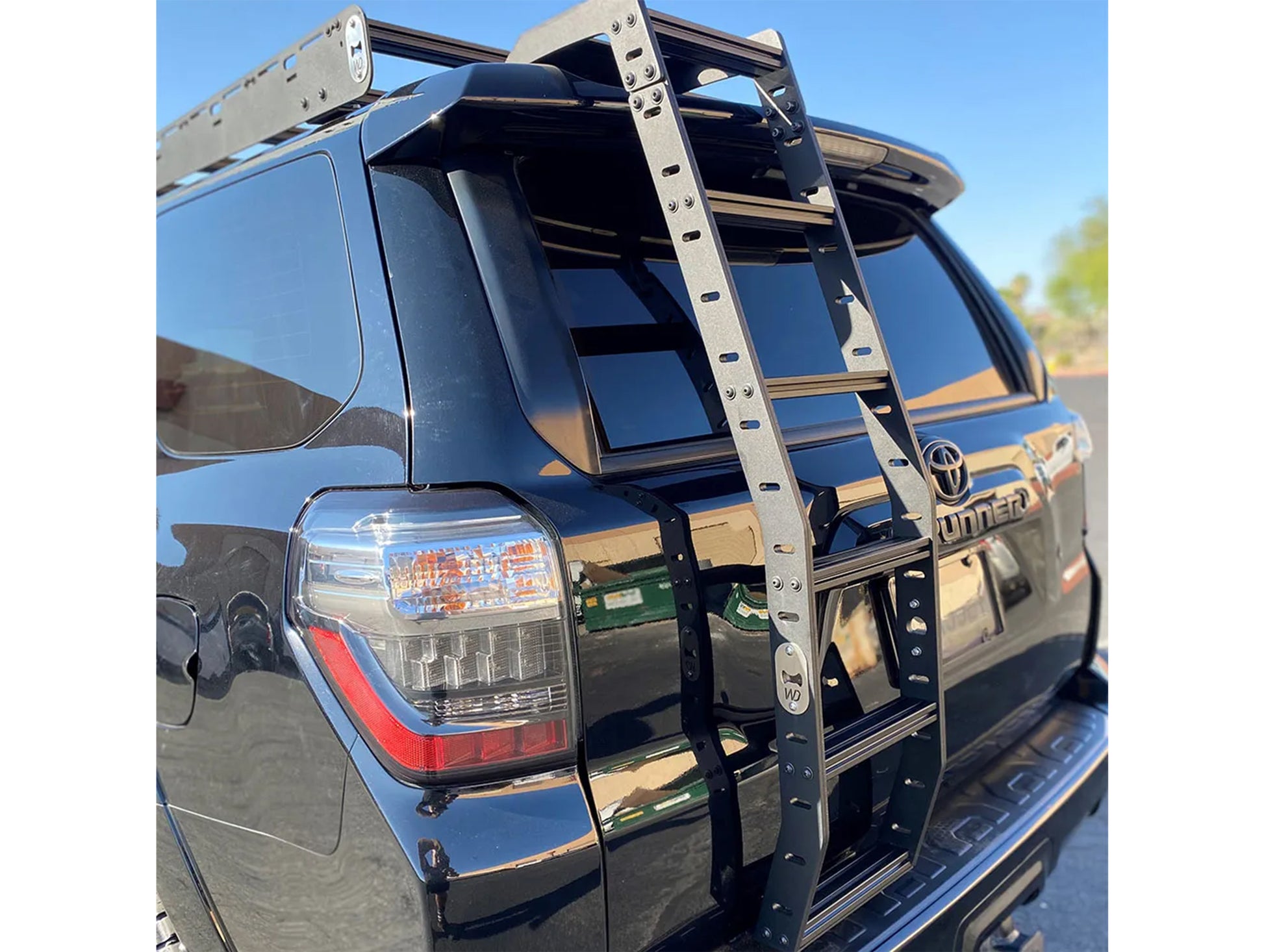 Westcott Designs 5th Gen (2010-2024) 4Runner rear hatch ladder. Construction is all aluminum to keep it light weight. The uprights are double layered 1/4 aluminum to make them super rigid. Westcott Designs realized with all the ladders on the market they just did not have large enough steps so they took it to the next level. They put in a 1”x 2” step to reassure a solid step ever time. Each step has tracks in it to allow for additional attachment points. This ladder is the most solid mounting ladder on the market!